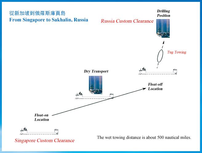 2008年5月期間,在“Transocean Nordic”從半潛船上以浮托的方式卸下後,“Transocean Nordic”需要以濕拖的方式從卸船地點拖帶500海裏到鑽探地。